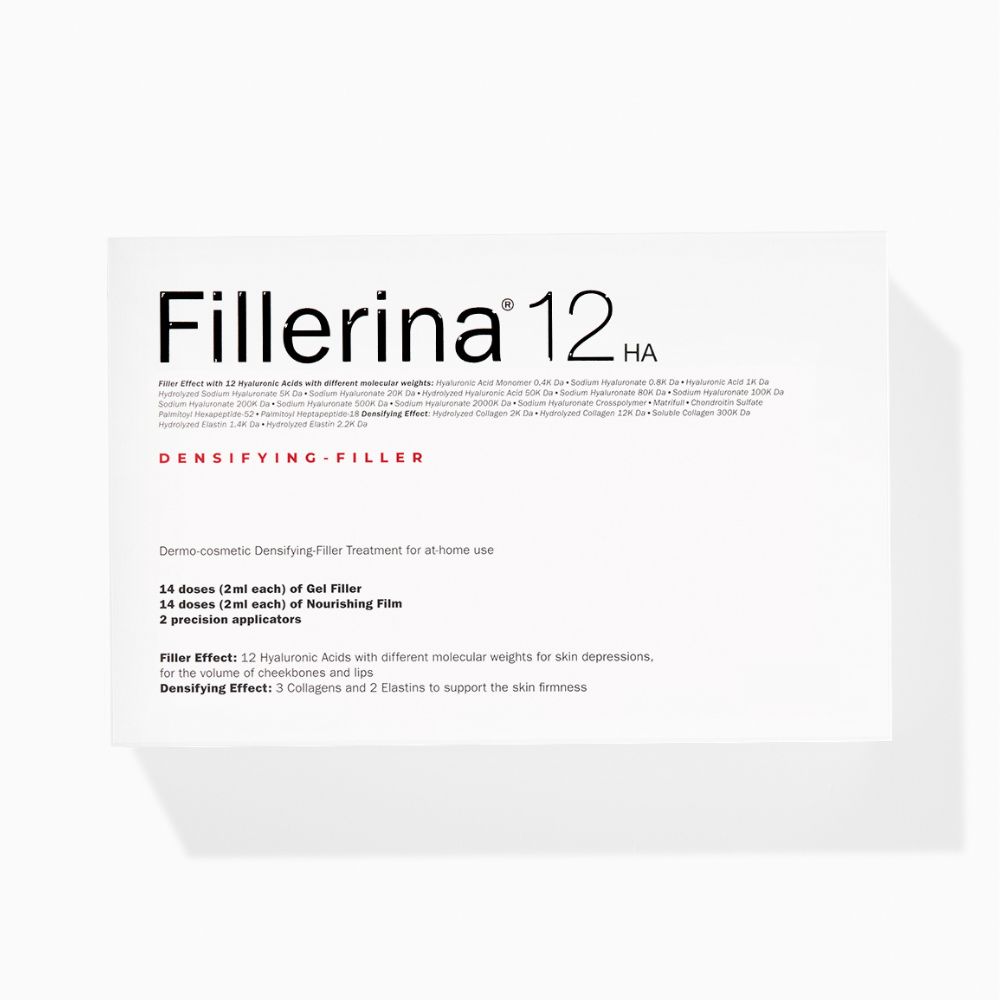 Fillerina 12HA tihendava täiteaine dermakosmeetiline hoolitsus on koduseks kasutamiseks mõeldud preparaat, mida kasutatakse 14 päeva ja mida kantakse spetsiaalse tömbi otsaga aplikaatoriga vananemisest tingitud kortsudele ja miimikajoontele ning kindlatele piirkondadele, mis vajavad rohkem volüümi (põsesarnad, huuled). Fillerina geeli koostis ühendab endas 12 erinevat tüüpi hüaluroonhapet 12 erineva molekulmassiga vahemikus 400 kuni 2 000 000 daltonit, et täita erinevaid nahakihte (molekulide läbitungimisvõimet on ex vivo testitud Franz Cells’iga). Need on seotud 3 kollageeni ja 2 elastiiniga, millel on tihendavad ja elastsust lisavad omadused. Geelil tuleb lasta 10 minutit mõjuda, seejärel ülejäänud toodet peopesaga sisse patsutada; siis tuleb toitev kaitsekile, mis sobib öökreemiks ja tagab nahale maksimaalse mugavuse.